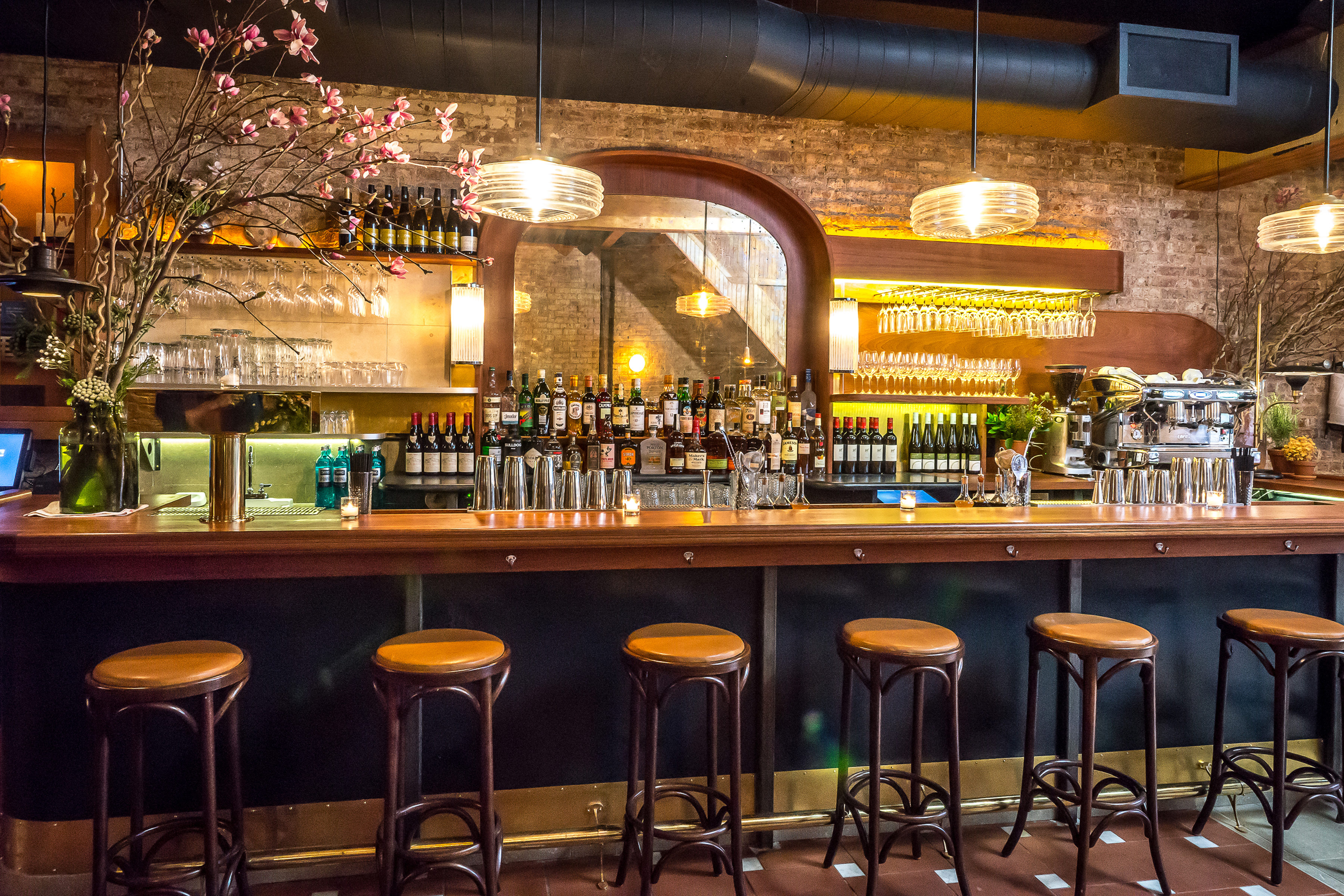 A warmly lit restaurant interior with wooden beams on the ceiling, people dining at tables along a brick wall adorned with paintings and decorative patterns, and glasses set on the tables.