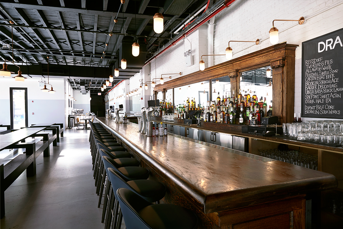 Modern bar with light wood paneling, globe pendant lights, white tiled bar counter, and tan leather stools. Shelves hold bottles and glassware; tables are visible in the background. Large windows let in natural light.