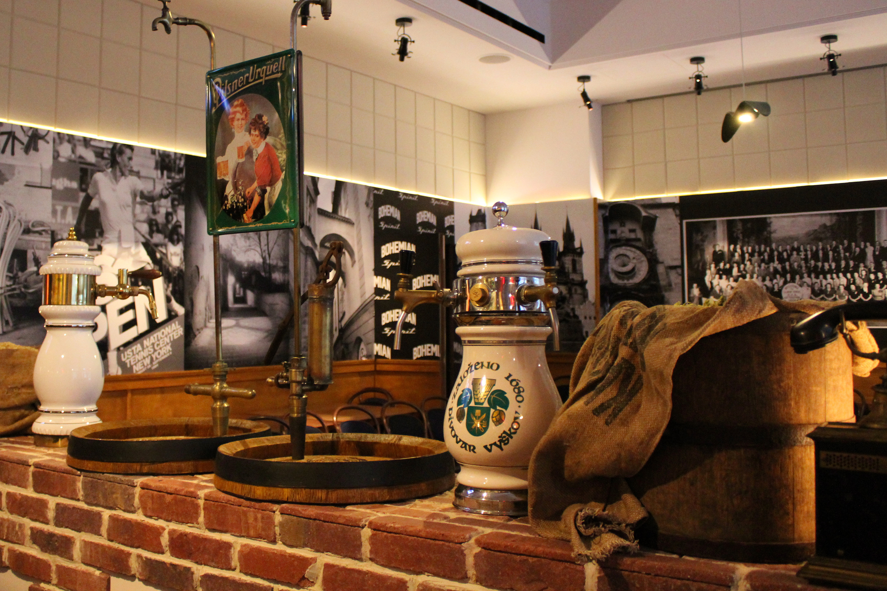 Modern bar with light wood paneling, globe pendant lights, white tiled bar counter, and tan leather stools. Shelves hold bottles and glassware; tables are visible in the background. Large windows let in natural light.