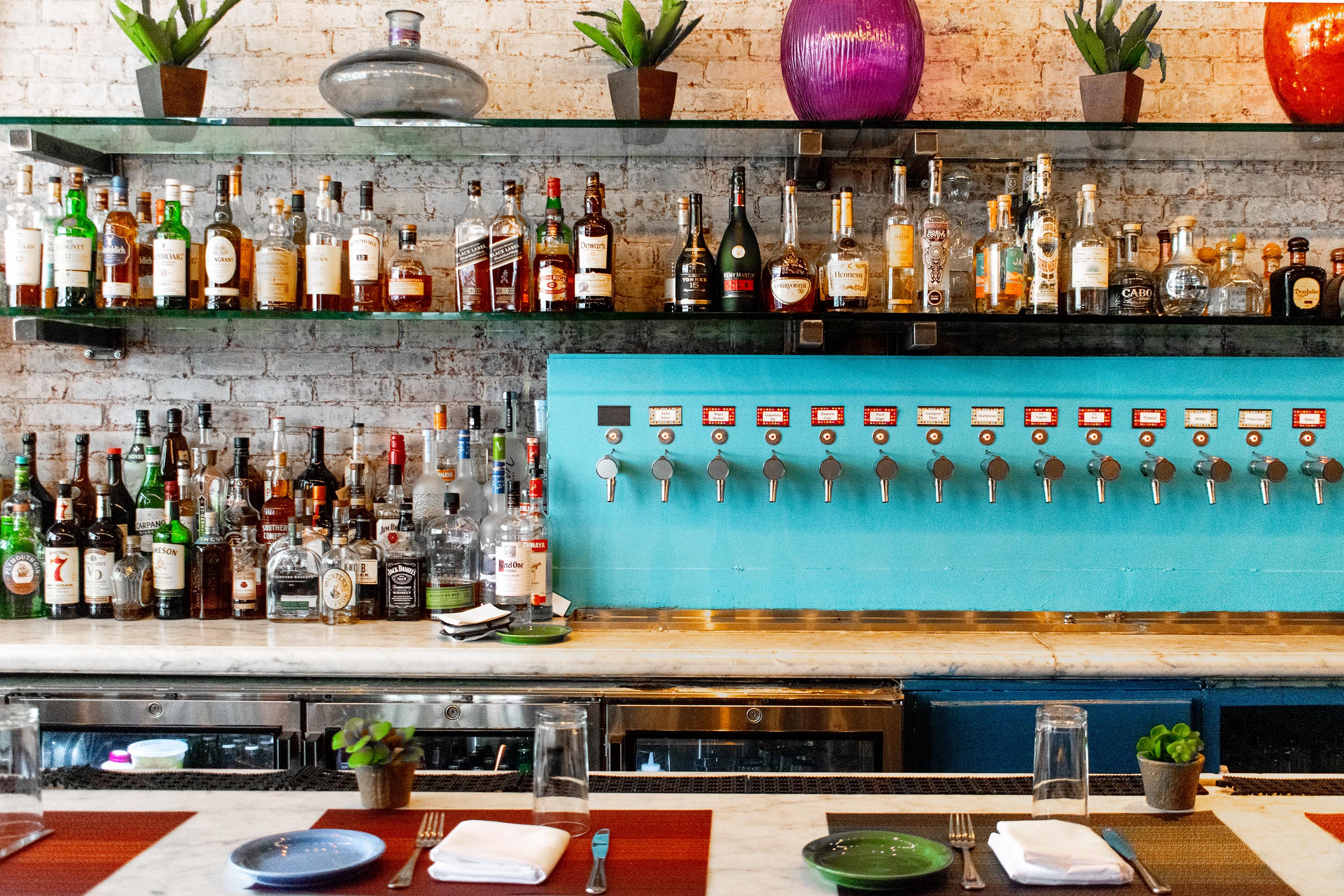 Modern bar with light wood paneling, globe pendant lights, white tiled bar counter, and tan leather stools. Shelves hold bottles and glassware; tables are visible in the background. Large windows let in natural light.