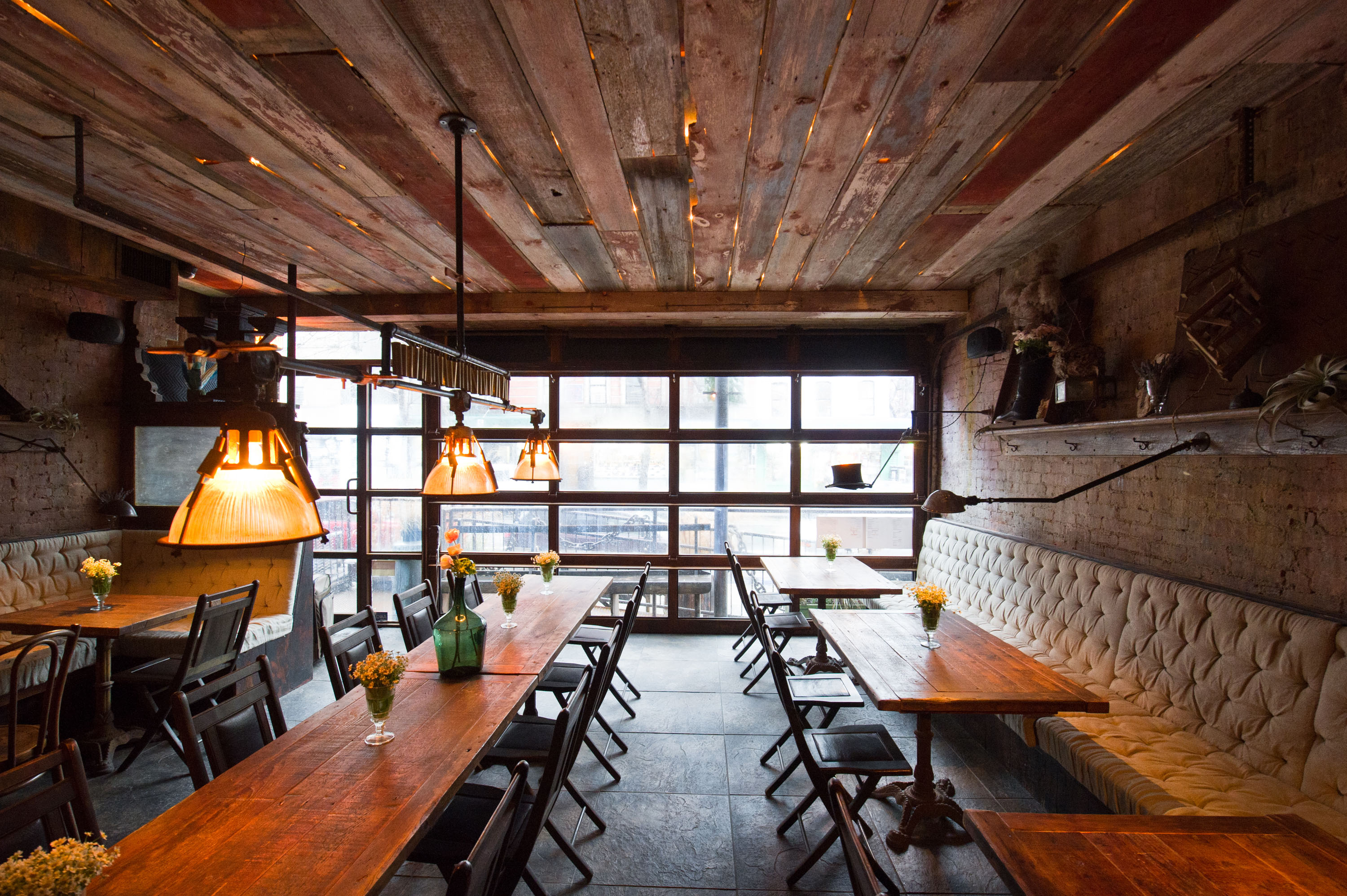 A warmly lit restaurant interior with wooden tables, modern chairs, place settings, and cushioned booths. The décor features earthy tones, exposed brick, and plants, creating a cozy and inviting atmosphere.