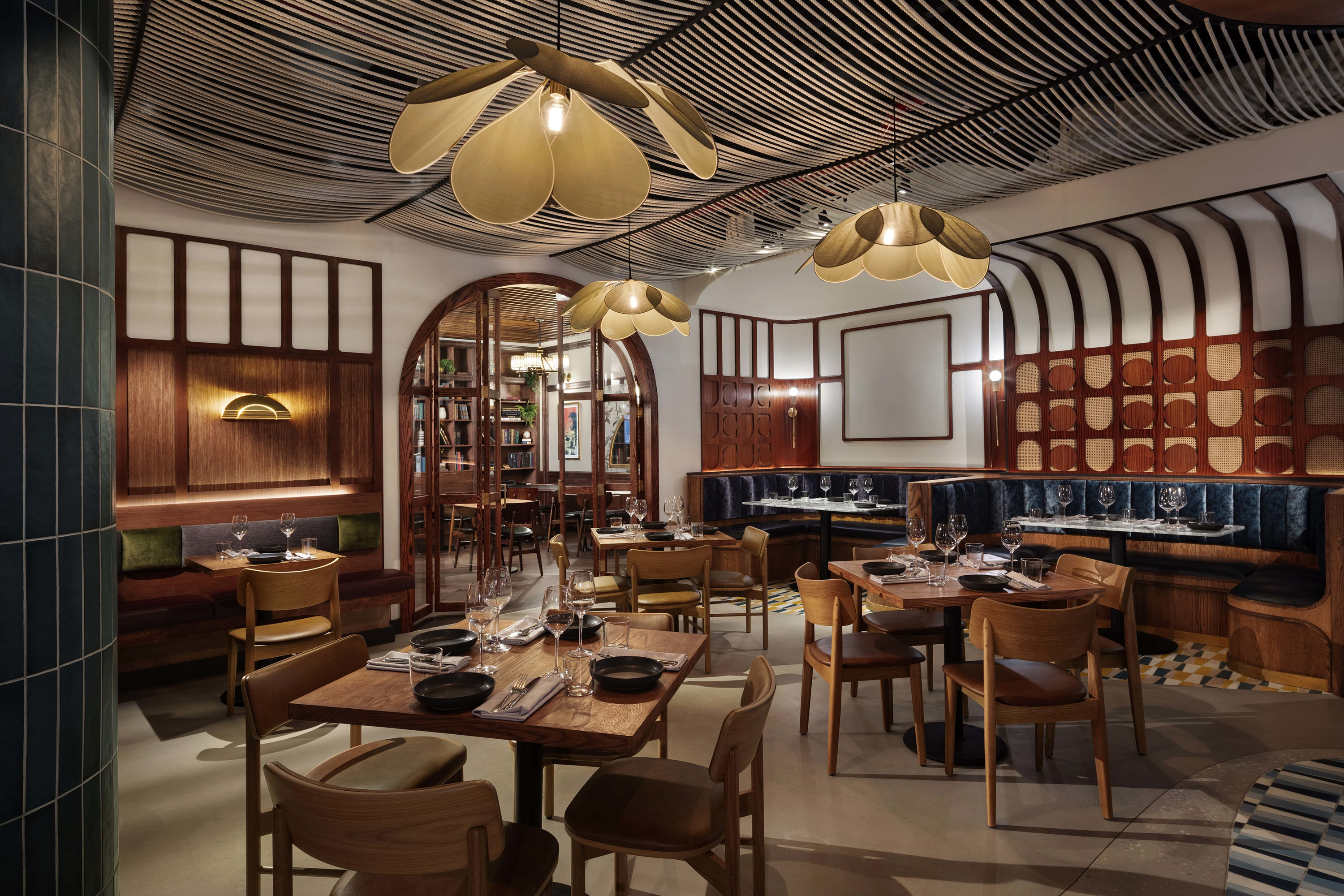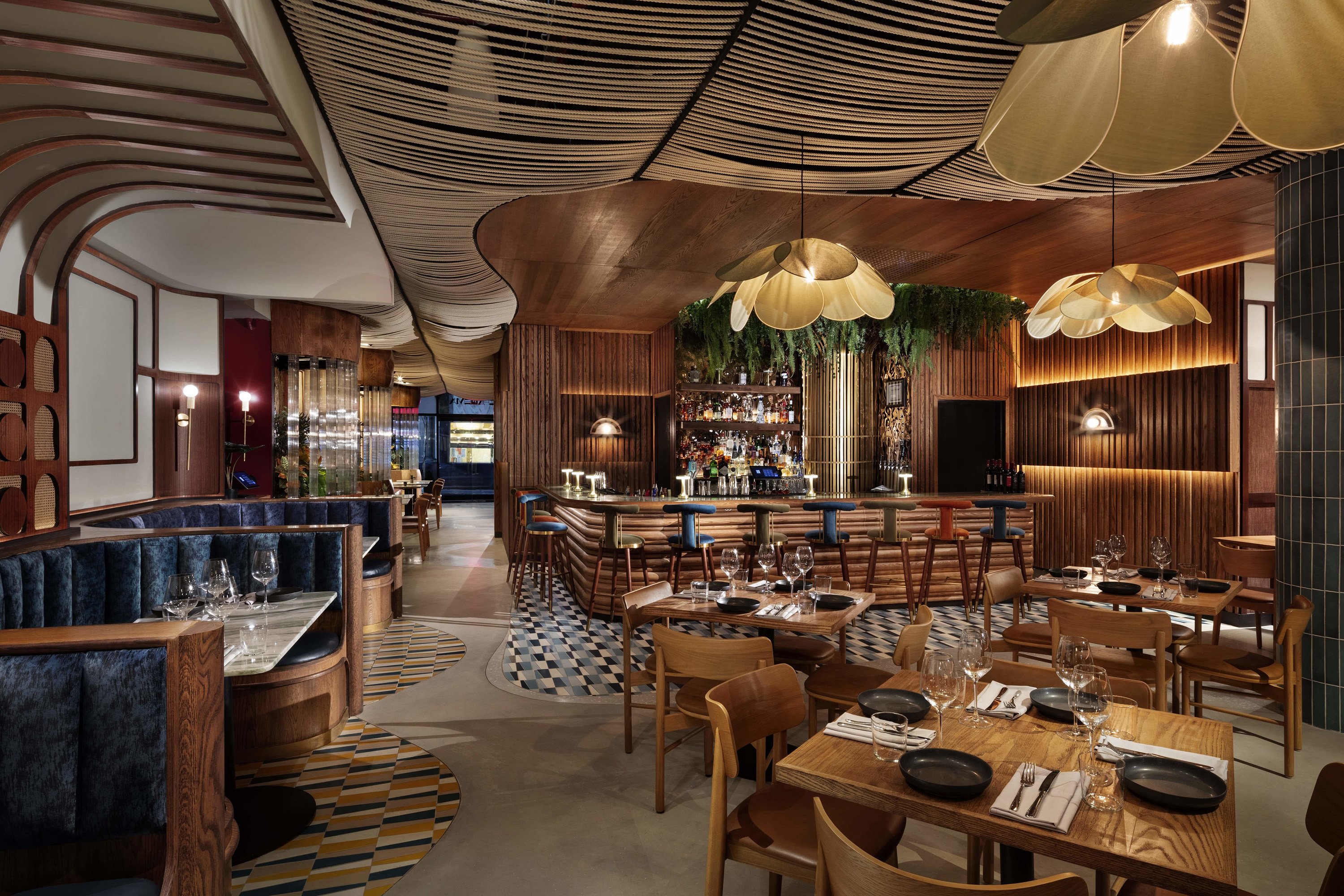 Modern bar with light wood paneling, globe pendant lights, white tiled bar counter, and tan leather stools. Shelves hold bottles and glassware; tables are visible in the background. Large windows let in natural light.