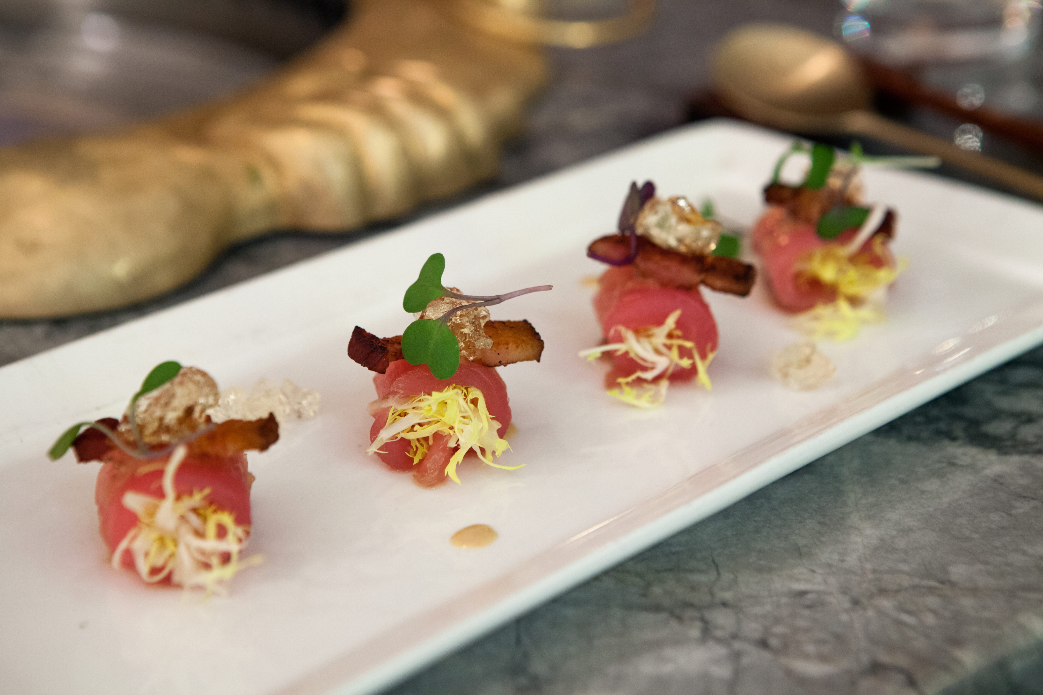 A white plate with thinly sliced fish, topped with small dollops of cream, garnished with herbs and sliced orange vegetables. A glass of white wine and a bowl of seafood are in the background on a marble surface.