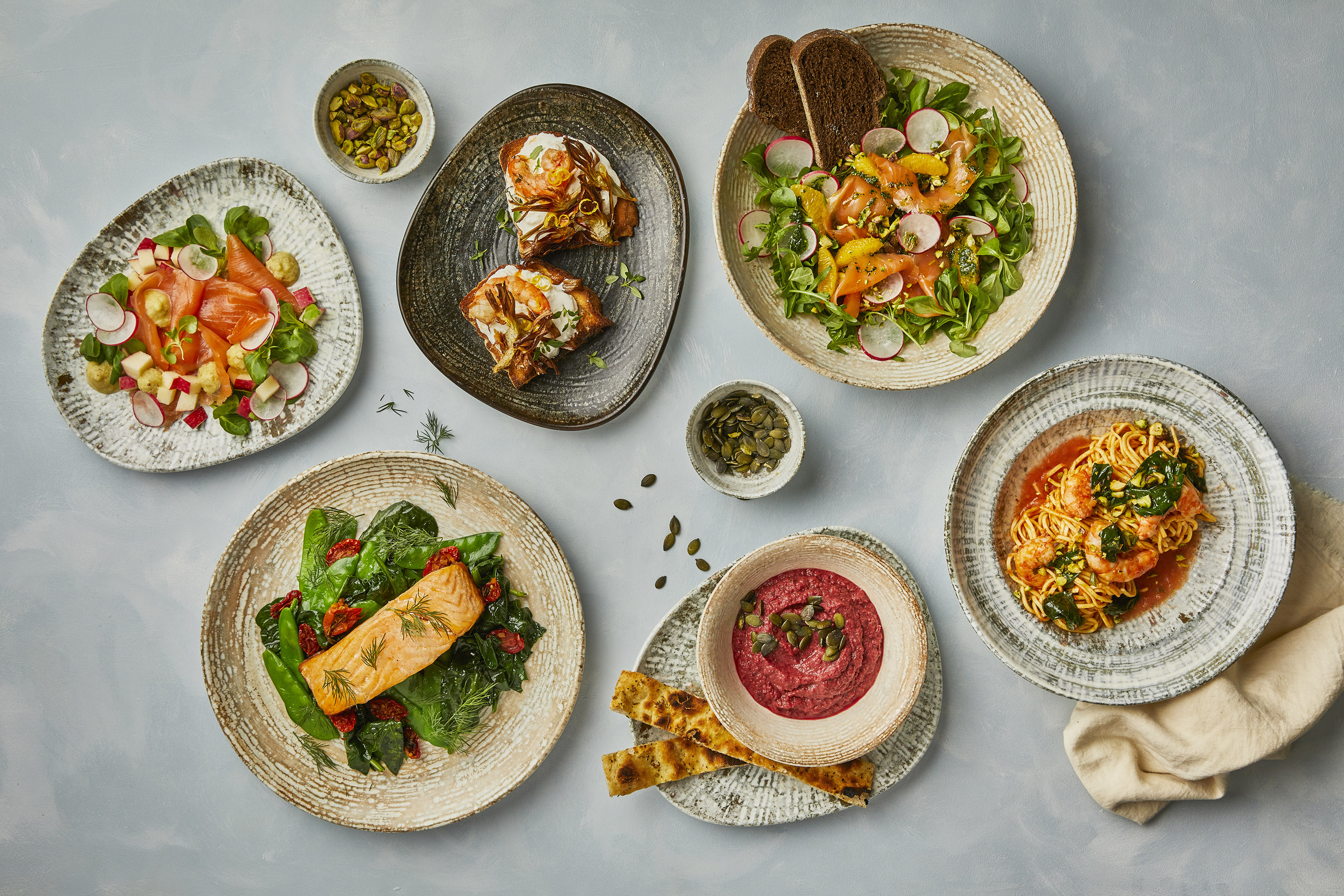 Assorted Middle Eastern dishes including pita, hummus, labneh, beet dip, tabbouleh, and baba ganoush in colorful bowls on a wooden table, with part of a menu visible.