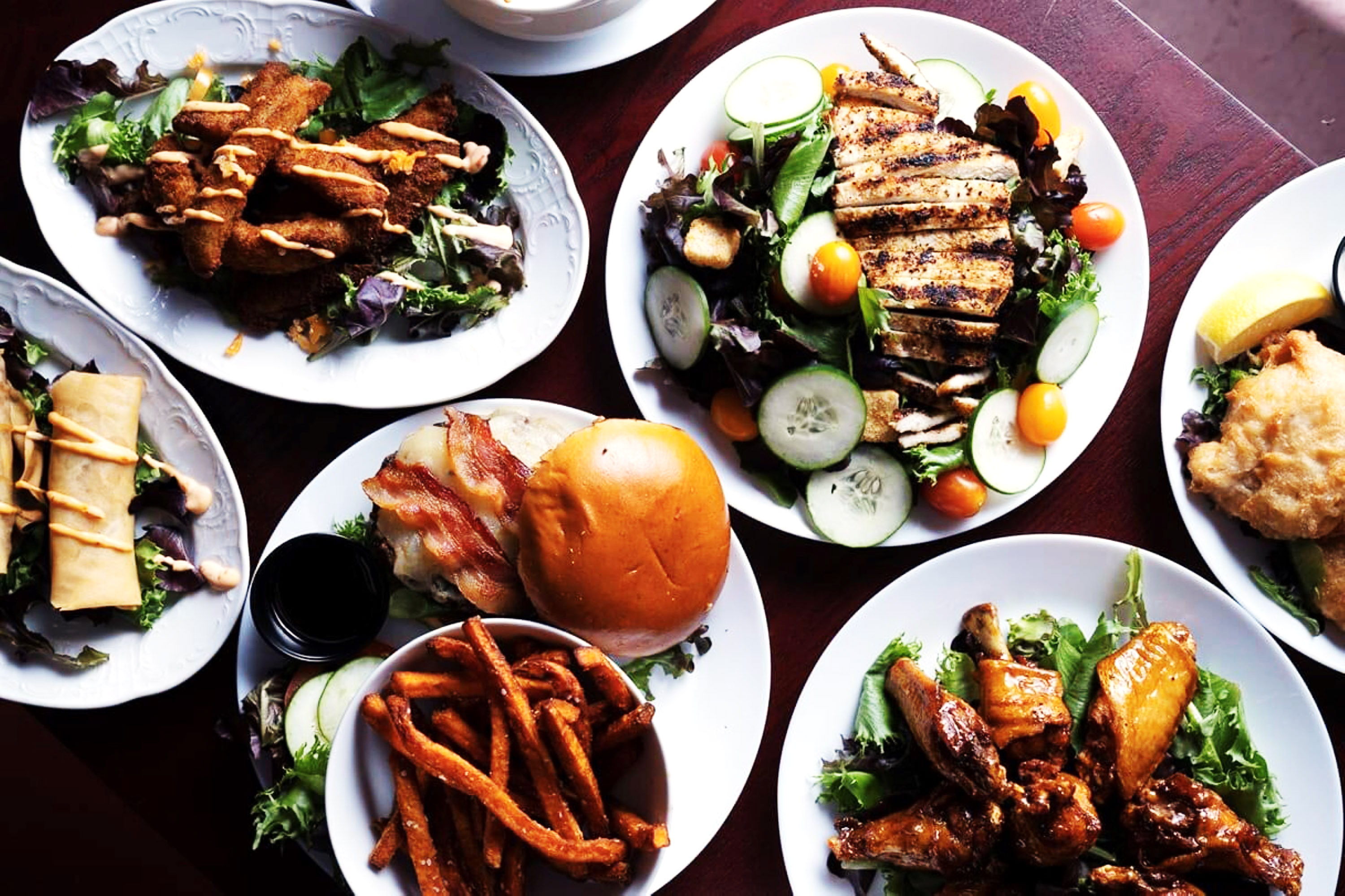 An overhead view of assorted dishes on a wooden table, including two fresh salads, a plate of fried appetizers with lemon wedges, falafel with dip, and a dish topped with fresh herbs and balsamic glaze.