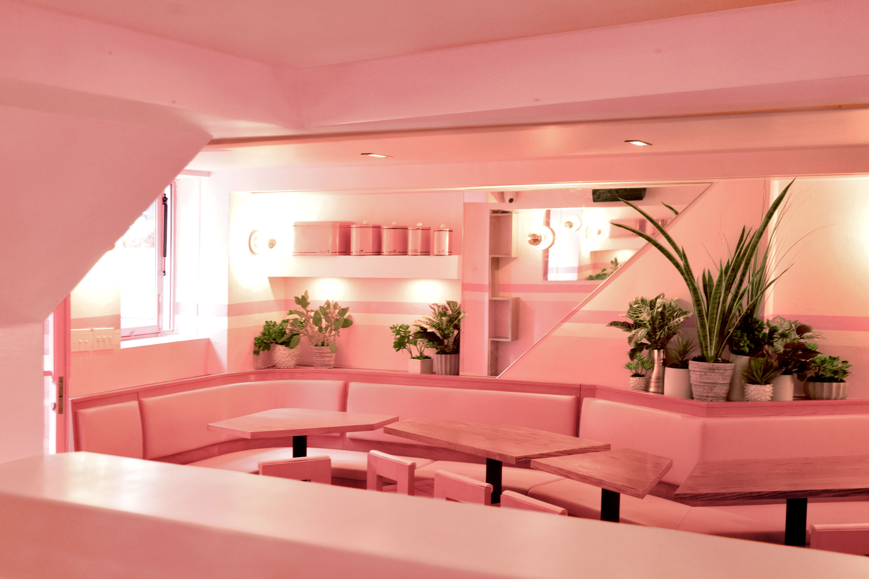 Bright, minimalist cafe interior featuring a large window, light wooden furniture, and stone counters. Rows of chairs line the counters, and shelves with bottles and items are on the left wall. Light streams in, creating an airy atmosphere.