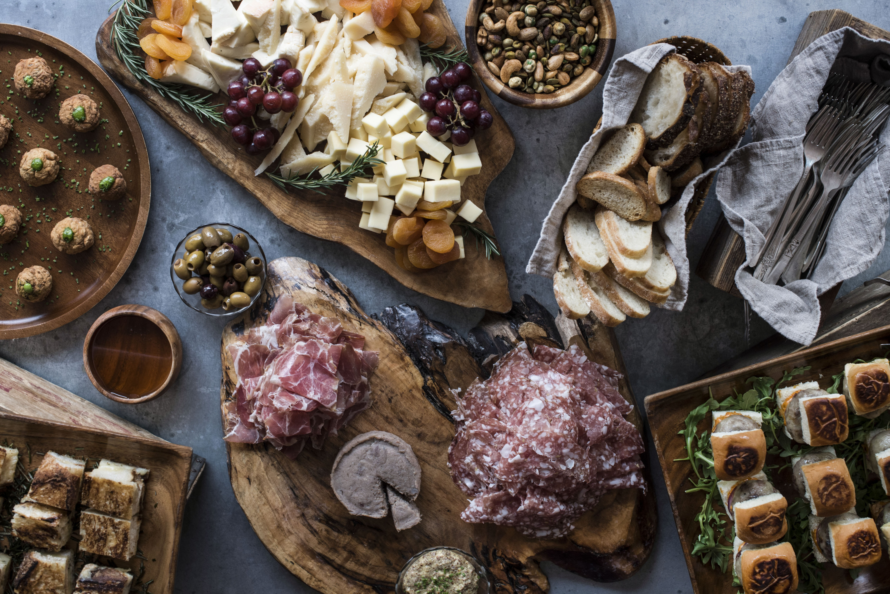 A table set with various dishes, including pasta, salad, grilled asparagus, charcuterie, chips with guacamole, cheese, olives, and a bottle of wine in the center, all arranged on a wooden surface.