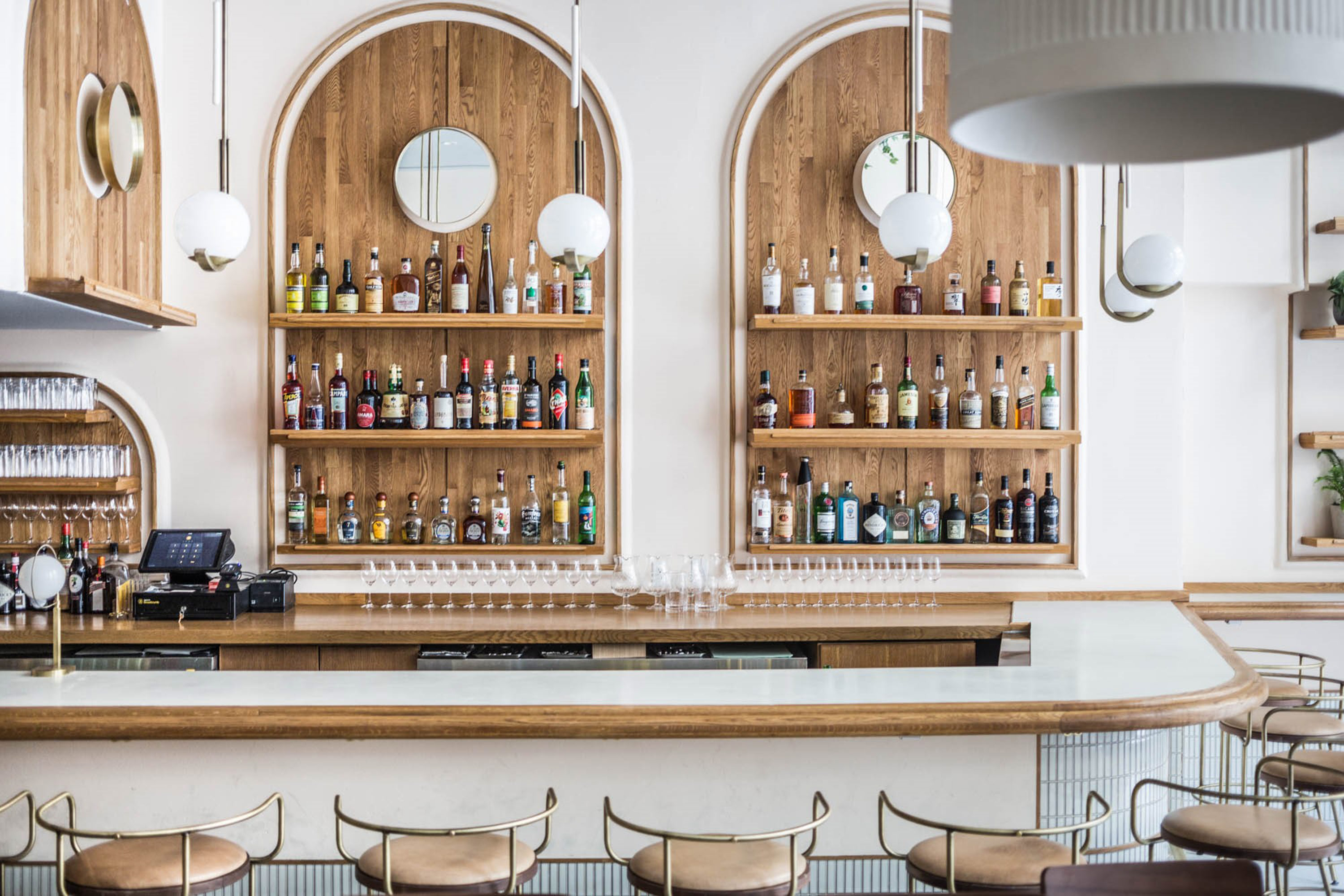 Cozy restaurant interior with elegantly set tables, cushioned chairs, and a bar lined with high-backed stools. Warm lighting highlights the decor, featuring neatly arranged glassware and tableware. Shelves behind the bar display an assortment of bottles.