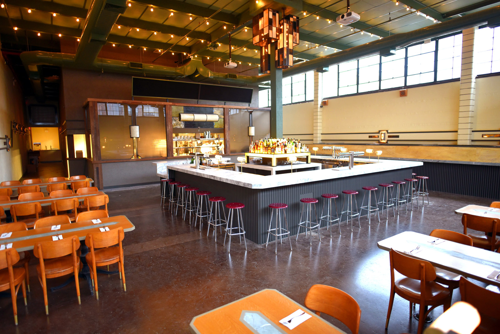 Modern bar with light wood paneling, globe pendant lights, white tiled bar counter, and tan leather stools. Shelves hold bottles and glassware; tables are visible in the background. Large windows let in natural light.