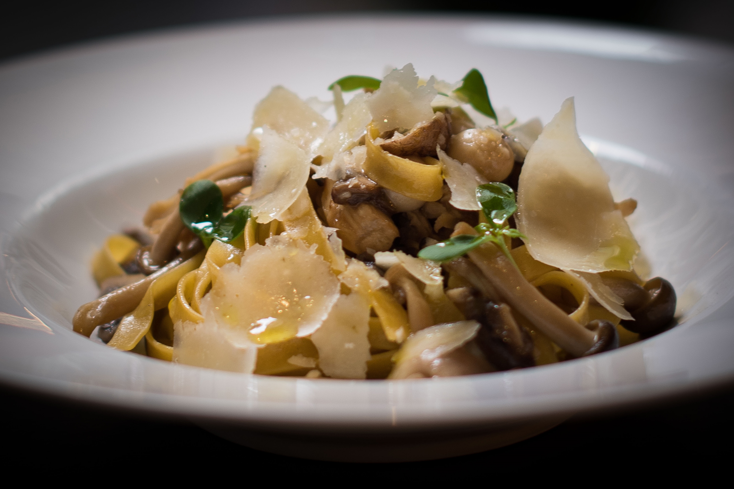 A rectangular portion of pasta topped with grated cheese and herbs is served on a white plate labeled "GRAND BRASSERIE," with a wine glass and menu visible in the background.